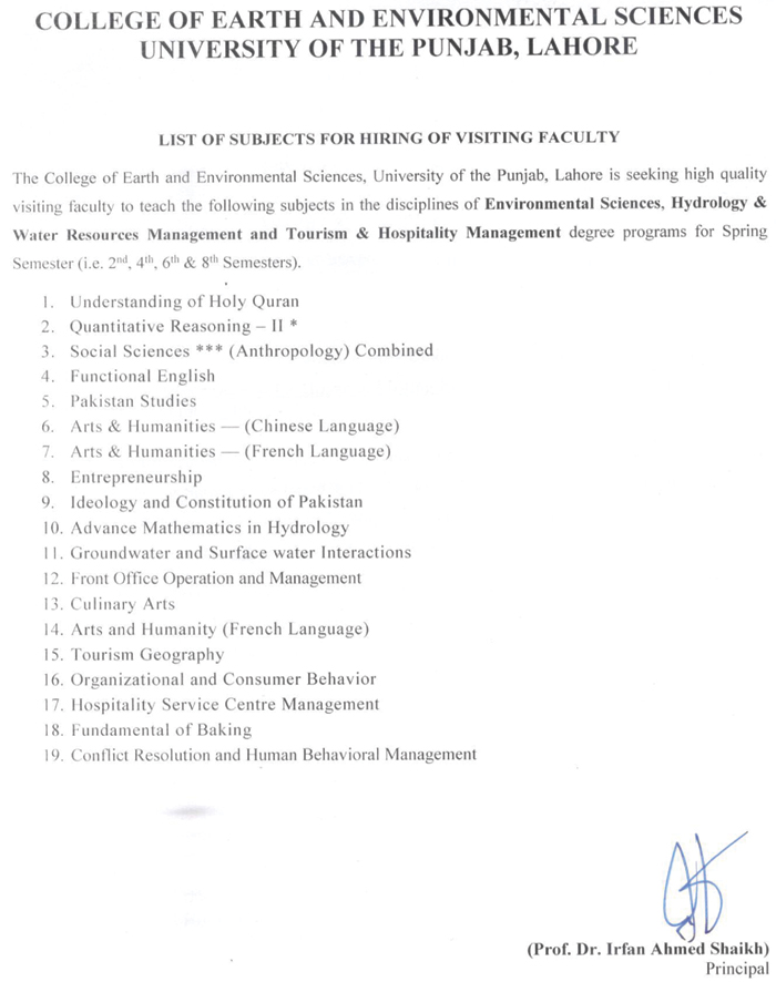 Job Type: Visiting Faculty Required (College of Earth & Environmental Sciences) No. of Posts: Department: College of Earth & Environmental Sciences