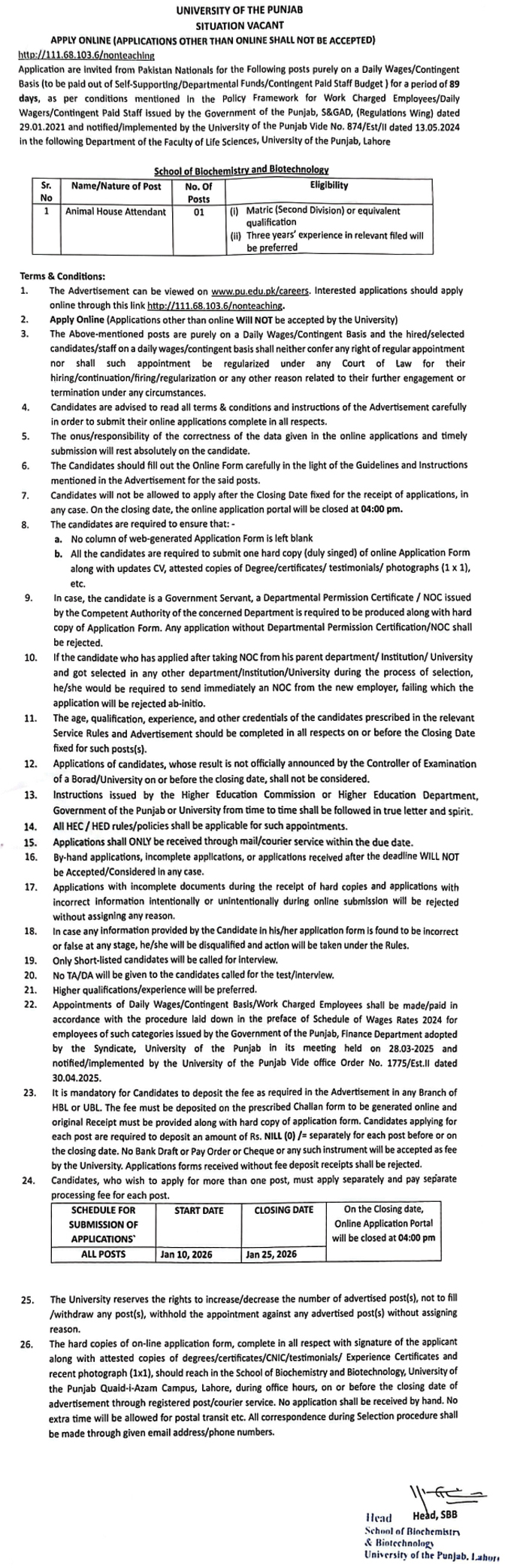 Job Type: SITUATION VACANT - Animal House Attendant (posts purely on a Daily Wages / Contingent Basis) No. of Posts: Department: School of Biochemistry & Biotechnology
