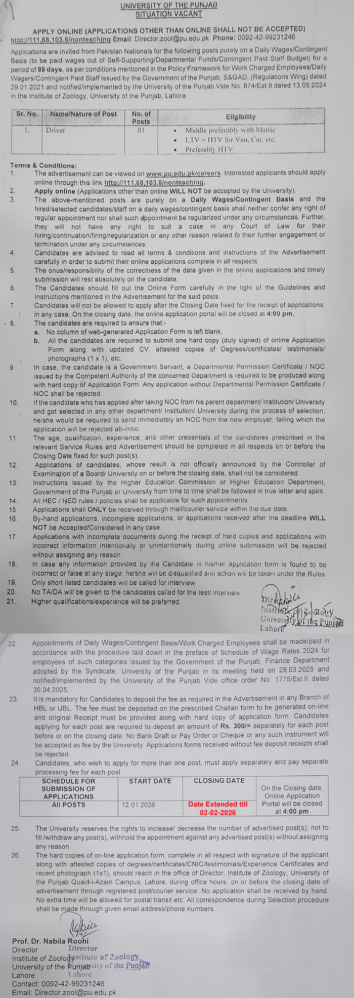 Careers SITUATION VACANT - Driver (posts purely on a Daily Wages / Contingent Basis) (Date Extended) Job Type: SITUATION VACANT - Driver (posts purely on a Daily Wages / Contingent Basis) (Date Extended)No. of Posts: Department: Institute of Zoology Apply online (applications other than online shall not be accepted) Click here to Apply Online http://111.68.103.6/nonteaching Email: director.zool@pu.edu.pk Phone: 0092-42-99231246 Requirement Criteria Closing Date 02-02-2026 Contact Back to Careers