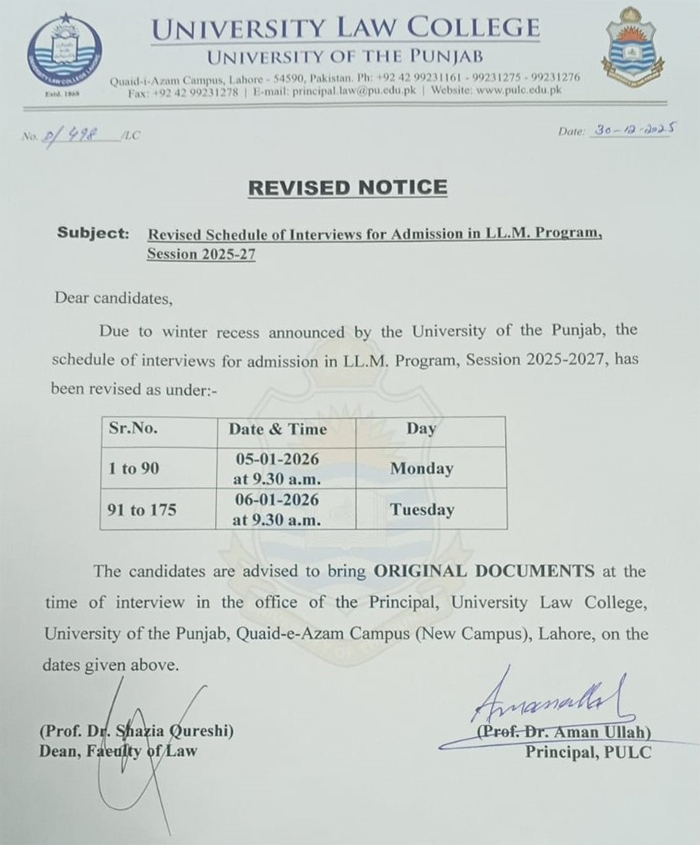 Revised Schedule of Interviews for Admission in LL.M. Program, Session 2025-27