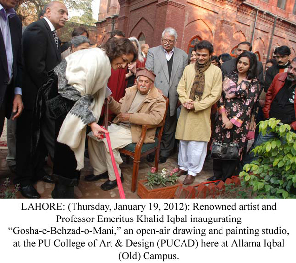 LAHORE: (Thursday, January 19, 2012): The inaugural ceremony of “Gosha-e-Behzad-o-Mani,” an open-air drawing and painting studio, was held at the Punjab University College of Art & Design (PUCAD) here at Allama Iqbal (Old) Campus. Renowned artist, father-figure of Pakistan art and Professor Emeritus Khalid Iqbal inaugurated the studio. PU Vice-Chancellor Prof Dr Mujahid Kamran, College Principal Prof Dr Rahat Naveed Masud, Principal College of Information Technology Prof Dr Syed Mansoor Sarwar, faculty members, renowned artists including Zulqarnain Haider, Zarah David, Nazish Ata Ullah, Jameela Zaidi, Dr Mussarrat Hassan, Sania Dar, Faryal Saigol, Quddus Mirza and a large number of art-lovers were also present on the occasion. Addressing the ceremony, VC Dr Mujahid Kamran commented the place as a valid contribution to the Architectural splendor the Punjab University. An Exhibition in memory of Anwar Afzal a pioneer teacher of the College, who passed away in December 2011, was also inaugurated at the occasion. The guests were also given calendars and Diaries of 2012 as a token of remembrance. Tweet Follow @pu_lhr_official |