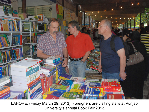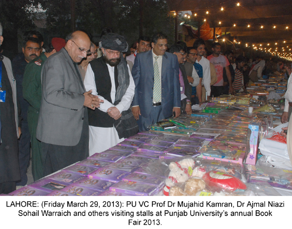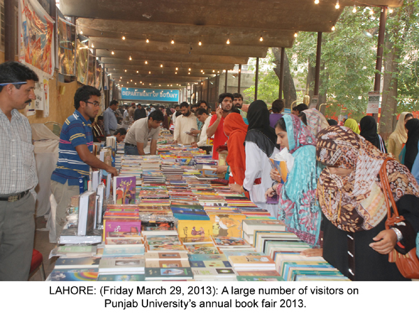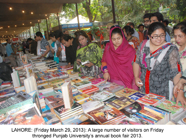 LAHORE: (Friday, March 29, 2013): Thousands of people from all walks of life on Friday thronged Pakistan's largest book fair and over 60,000 books have been sold in just 2 days. People have thanked PU administration for ensuring provision of books on extra-ordinary discount and making best arrangements for visitors. Families are encouraged to visit the book fair today (Saturday). Senior journalists, poets, writers, foreigners, government officials, doctors, lawyers, students from different schools, colleges and universities, businessmen etc visited book fair on 2 nd day and got maximum benefit from upto 50 percent discount on books. Senior journalist Altaf Hassan Qureshi said that books fair was the best opportunity for students and it should be organized 6 times in a year.