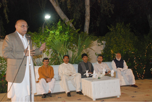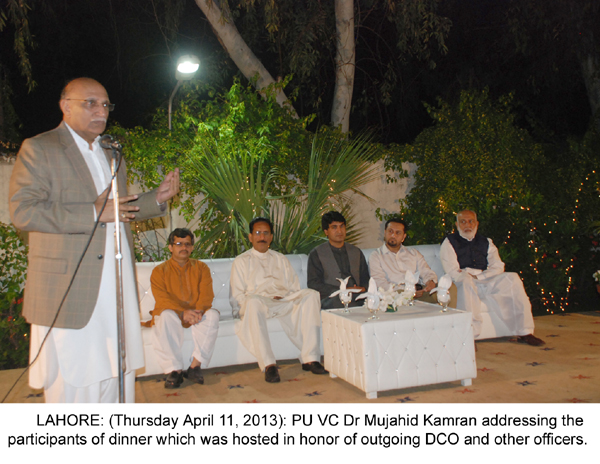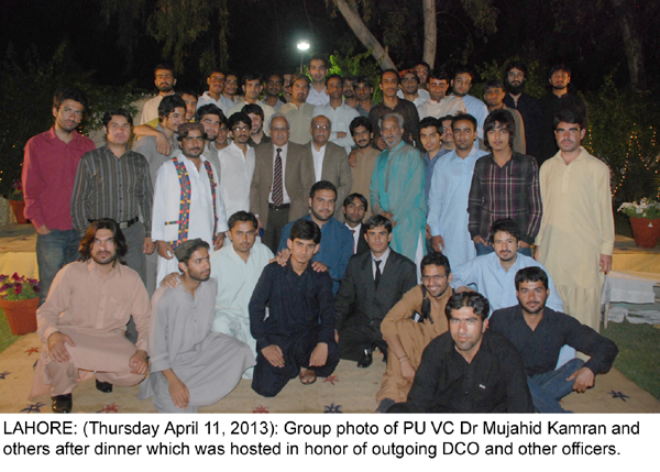 LAHORE: (Thursday, April 11, 2013): Punjab University Vice Chancellor Prof Dr Mujahid Kamran hosted dinner in honor of outgoing District Co-ordination Officer Noor-ul-Amin Mangal at VC House. People from various walks of life including Jahangir Badar, Khawaja Imran Nazir, Inaam Ullah Niazi, Ch Muhammad Akram, Dr Ajmal Niazi, Altaf Hassan Qureshi, Muwahid Hussain Syed, Isar Rana, VC’s from different universities, members of ASA and Syndicate, Politicians and Social Workers, Deans, Principals, Teachers and a large number of Baloch Students were also present on the occassion. The Vice Chancellor lauded the initiatives of Mr Mengal in beautifying Lahore and performing duties in an excellent manner. Mr Mangal thanked Vice Chancellor for providing free education and boarding facilities to Baloch students in Punjab University. Tweet Follow @pu_lhr_official |