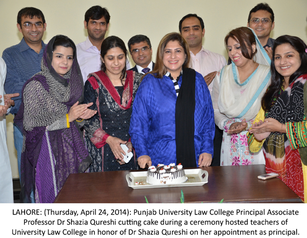 LAHORE: (Thursday, April 24, 2014): The Punjab University Law College’s faculty members have hosted a ceremony in the honor of newly-appointed Principal Associate Professor Dr Shahzia Qureshi. On this occasion, Dr Amanullah, Umair Farooq Niazi, Major (r) Maqsood Mann, Naeemullah, Marium Ehsan, Zarfashan Qaiser, Iram Fatima, Abida Yasin, Zulfiqar Shah, Ali Nawaz Khan, Jawad Riaz, Zaheer Iqbal Cheema, Imran Alam, other faculty members and administrative staff were present on the occasion. All the faculty members congratulated Dr Shazia for her appointment and said that the college was making rapid progress under her supervision. Later, a cake cutting ceremony was also held. Tweet Follow @pu_lhr_official |