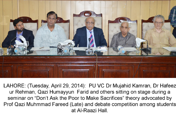 LAHORE: (Tuesday, April 29, 2014): Punjab University Department of Economics in collaboration with Qazi Muhammad Fareed Memorial Society organizes a seminar on “Don’t Ask the Poor to Make Sacrifices” theory advocated by Prof Qazi Muhmmad Fareed (Late) and debate competition among students at Al-Raazi Hall. PU Vice Chancellor Prof Dr Mujahid Kamran, Chairman Department of Economics Prof Dr Hafeez ur Rehman, Chairman Muhammad Fareed Memorial Society Qazi Humayun Fareed, former Ambassador Iqbal Ahmed, economists, faculty members and a large number of students were present on the occasion. Addressing the ceremony, Dr Mujahid Kamran said that students must read books of other subjects and co-curricular literature. He said that distance from education was the only reason behind the downfall of the Muslims. He said that the subject of economics was much important in the present scenario and economists could play role for strengthening the economy of the country. He congratulated Dr Muhammad Hafeez-ur-Rehman and others for organizing a healthy activity for students’ training. Dr Hafeez said that the problems and poverty ratio of our country were increasing due to incorrect use of resources and there was need to take steps in this regard. A debate competition was also organized in which students spoke on “Don’t Ask the Poor to Make Sacrifices”. Ms. Hina, Syed Usman and Muhammad Sajjad won first, second and third positions and received cash prizes of Rs 35,000, 25,000 and 15,000 respectively. Tweet Follow @pu_lhr_official |