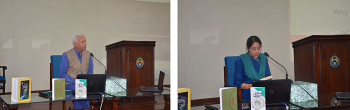 The introduction to the Persian Book "Maqalat-e- Shams Tabrazi" was presented by Prof Dr Moeen Nizami, Professor Dept of Persian PU. His scholarly talk on the book was highly appreciated by the audience. He, in a brief and precise manner, presented the biographical sketch of the Shams-ud-Din Muhammad Tabrazi by narrating the author’s statements. Dr. Moeen rejected the immoral allegations levied by some European scholars on Shams Tabrazi, while presenting intellectual pieces of evidence from the book. |