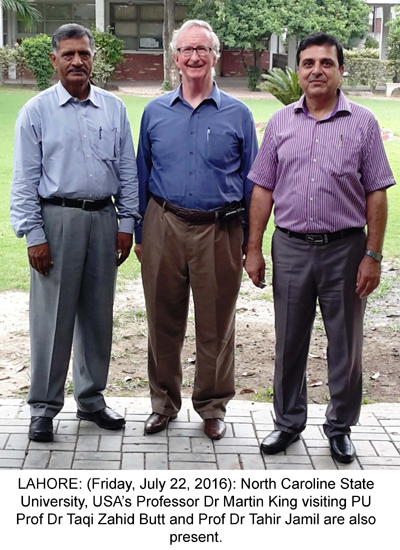 LAHORE: (Friday, July 22, 2016): North Caroline State University, USA’s Professor Dr Martin King has visited Punjab University Department of Polymer Engineering & Technology regarding research collaboration between Pakistan and the United States on the development of innovative technical textile and medical textile products. Dean Faculty of Engineering and Technology Prof Dr Taqi Zahid Butt and Chairman Department of Polymer Engineering & Technology Prof Dr Tahir Jamil welcomed the US professor and discussed various issues of mutual interest. Tweet Follow @pu_lhr_official |