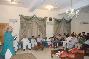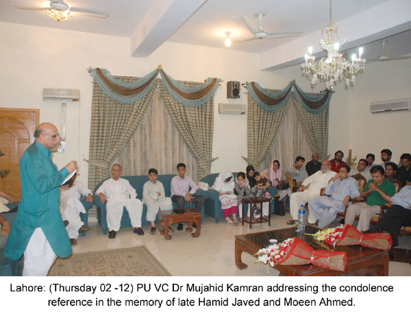 LAHORE: (Thursday, Aug 02, 2012): PU VC Dr Mujahid Kamran, Prof Dr Shafique Jullandhry, Prof Dr Mujahid Mansoori, Pervaiz Bashir, Khawar Naeem Hashmi, Prof Dr Javed Akram, Arshad Ansari, Sarmad Bashir, Amjad Warraich, Mobeen Ahmed, Father in Law of Hamid Javed and Adnan Lodhi speaking at condolence reference in the memory of late Hamid Javed and Moeen Ahmed. PU VC Dr Mujahid Kamran, GCU Vice Chancellor Dr Khaleeq ur Rehman and others offering fateha at condolence reference in the memory of late Hamid Javed and Moeen Ahmed. PU VC Dr Mujahid Kamran addressing the condolence reference in the memory of late Hamid Javed and Moeen Ahmed. PU VC Dr Mujahid Kamran presenting bouquet to late Moeen’s brother Mobeen at condolence reference in the memory of late Hamid Javed and Moeen Ahmed. Family of late Hamid Javed sitting at condolence reference in the memory of late Hamid Javed and Moeen Ahmed. Tweet Follow @pu_lhr_official |