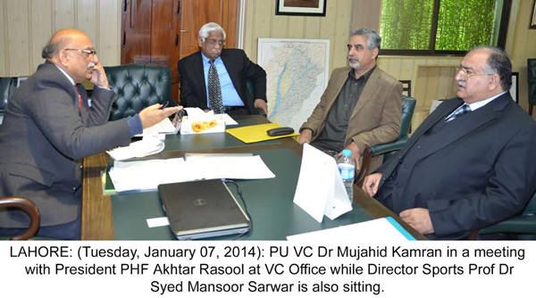 LAHORE: (Tuesday, January 07, 2014): Punjab Chief Minister Mian Muhammad Shahbaz Sharif has approved Astro turf for Punjab University Old Campus ground for promotion of hockey in Pakistan. In this regard, President Hockey Federation Akhter Rasool called on PU Vice Chancellor Dr Mujahid Kamran at his office and informed him about the step taken by the government. PU Director Sports Prof Dr Mansoor Sarwar was also present on the occasion. Dr Mujahid Kamran said that Mian Shahbaz Sharif was taking right initiatives to incline young generation to healthy and positive activities. He said that a large number of players would benefit from the decision as the ground had a splendid tradition of producing renowned Olympians. Tweet Follow @pu_lhr_official |