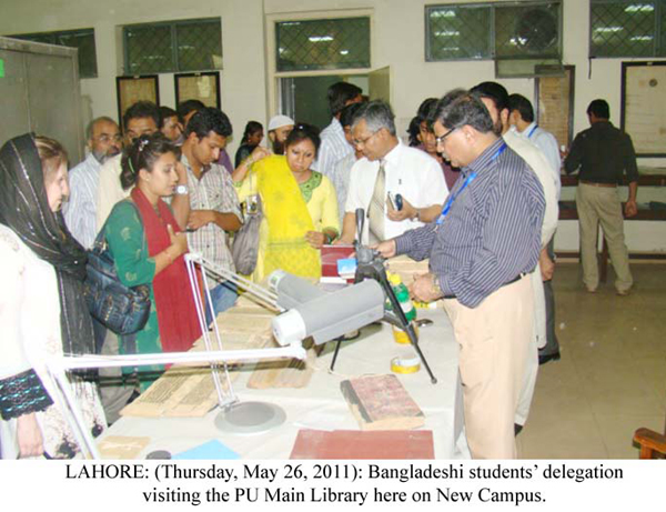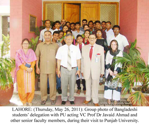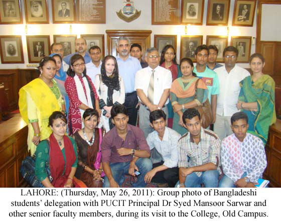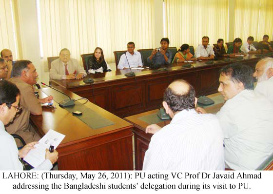 LAHORE : (Thursday, May 26, 2011): A 20-member students' delegation from Bangladesh , under the leadership of Dr. Shahid Akhtar Hussain, visited the Punjab University on Thursday. The delegation, first, visited the PU College of Information Technology, where they were welcomed by College Principal Prof. Dr. Syed Mansoor Sarwar, Director External Linkages Maria Maldonado and other faculty members. Dr. Syed Mansoor Sarwar briefed the delegation about the teaching programmes being offered at the College and apprised them about the academic and research progress made in recent years. He said foreign students had also been studying in the College which also provided scholarships to talented and needy students. The delegation visited the college's library, IT lab, GIS Centre, seminar room, VC office, Senate and Sherani Halls. The delegation went to Oriental College where Principal Prof. Dr. Mazhar Moeen told the delegation about the history, infrastructure, departments and the academic programmes. He also told the delegation that the College had been offering courses in foreign languages at the Institute of Languages . Advisor to VC Col (r) Ikramullah and Director External Linkages Maria Maldonado led the delegation to New Campus where they met with Acting Vice-Chancellor Prof. Dr. Javaid Ahmad, deans of faculties and senior faculty members in the Al-Raazi Hall of Centre for Undergraduate Studies, New Campus. Registrar Prof. Dr. Muhammad Akhtar, Controller Examinations Prof. Dr. Liaqat Ali, Dean Faculty of Arts & Humanities Prof. Dr. Qalb-i-Abid, Dean Faculty of Islamic Studies Prof. Dr. Hafiz Mahmood Akhtar, Director Undergraduate Studies Centre Prof. Dr. Amir Ijaz, RO-I Javed Sami and other faculty members. Speaking on the occasion, the delegation's leader Dr. Shahid admired the hospitality of the Punjab University and Punjab Government and said the students felt much pleasure to visit the varsity. He said the students' visit would further develop mutual relations between the two countries. Later, the delegation visited the Main Library and took a round of various sections of the library. The delegation members openly exchanged views on various topics with the students, present in the library. The delegation afterwards visited the Institute of Communication Studies (ICS) where the Institute's Director Dr. Ahsan Akhtar Naz briefed them about the academic and research prorgrammes and faculty members of the Institute. The delegates also visited library, TV studio and FM radio of the Institute. The Bangladeshi students also expressed their views about their visit to PU on the occasion and said they were given the impression that Pakistan 's security situation was no good but they found no issue with the security in Pakistan . Later, the delegation had lunch at the Executive Club. Tweet Follow @pu_lhr_official |