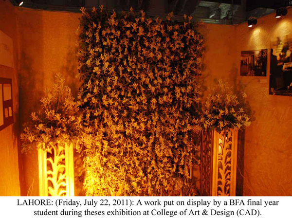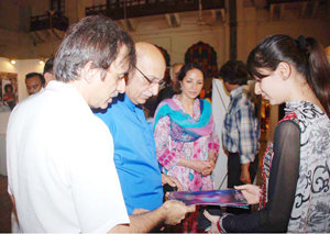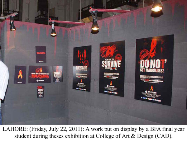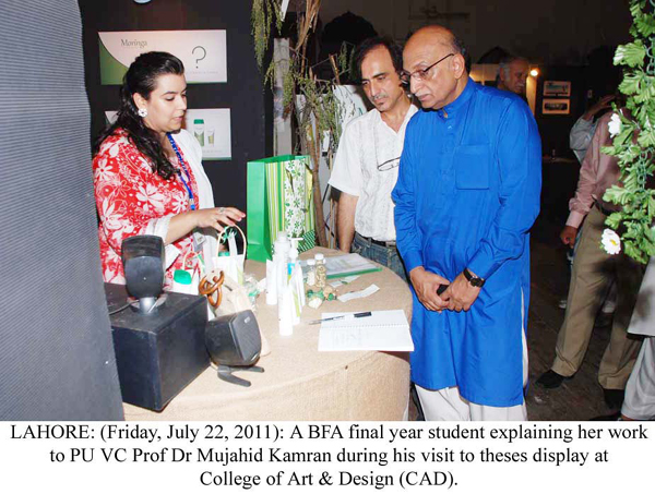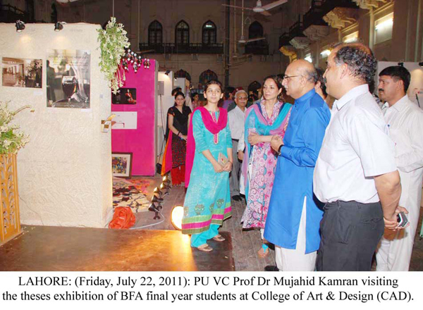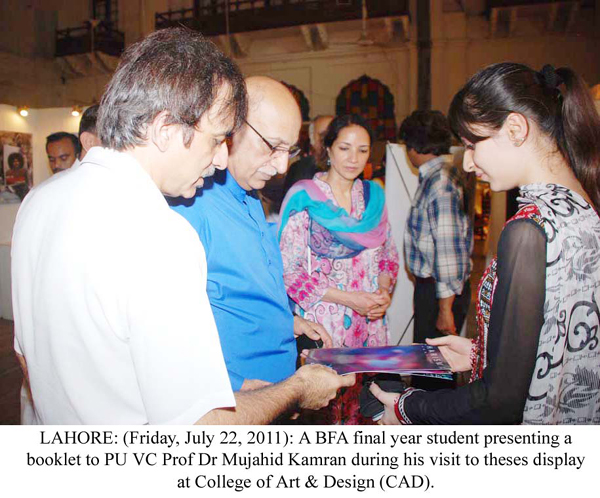 LAHORE: (Friday, July 22, 2011): Punjab University Vice-Chancellor Prof Dr Mujahid Kamran visited the theses exhibition of Bachelor of Fine Arts (BFA) final year students at College of Art & Design (CAD), Allama Iqbal (Old) Campus. College Principal Prof Dr Rahat Naveed Masud, College of Information Technology Principal Prof Dr Syed Mansoor Sarwar, college faculty members and a large number of students were present on the occasion. Talking to media after the visit, Vice-Chancellor Dr Mujahid Kamran said the creative, effective and quality work of students, relating to advertising, put on display was much appreciable. He said the students’ work was reflection of their creative faculties and it could be compared to the work of national and international level. He appreciated the hard work and commitment of college’s teachers to polish the creative skills of students. College Principal Dr Rahat Naveed Masud said the students of graphic design, painting and sculpture, in their quality work, have highlighted various aspects of woman’s life. He thanked the Vice-Chancellor and said his arrival had encouraged the students. Project Head Israr Chishti said the objective of exhibition was to promote students’ skills and make them capable to communicate their message to general public easily through their work in the professional lives. Tweet Follow @pu_lhr_official |