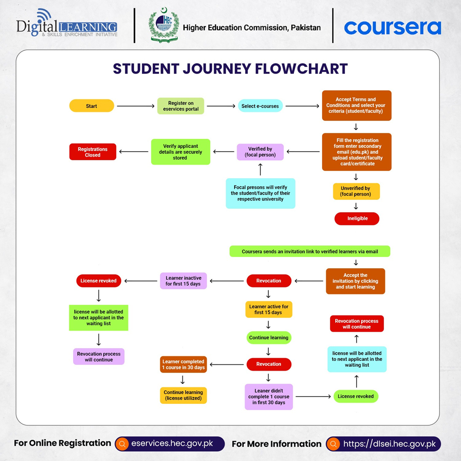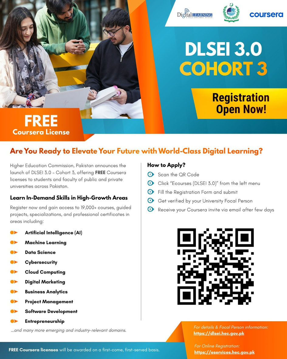 The Digital Learning & Skills Enrichment Initiative (DLSEI) is an initiative of the Higher Education Commission (HEC) Pakistan in partnership with Coursera. DLSEI intends to enhance online learning and skills development among passionate students. They will be able to access courses and certifications from top universities of the world and get an opportunity to enroll themselves in the highest-ranked and most expensive online courses. |