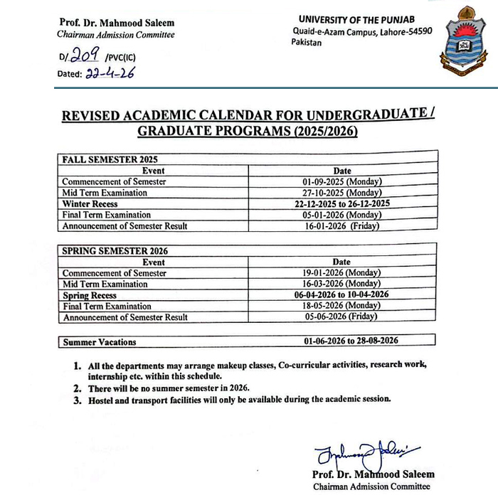 Revised Academic Calendar for Undergraduate / Graduate Programs (2025/2026)