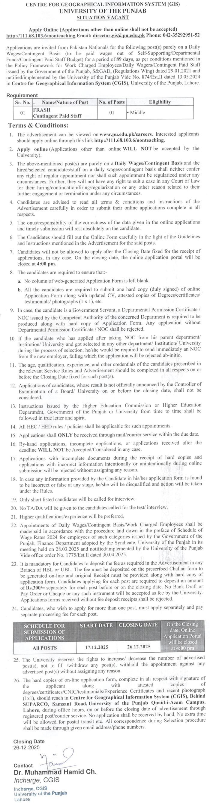 Careers SITUATION VACANT - Frash (posts purely on a Daily Wages / Contingent Basis) Job Type: SITUATION VACANT - FrashNo. of Posts: Department: Centre for Geographical Information System Apply online (applications other than online shall not be accepted) Click here to Apply Online http://111.68.103.6/nonteaching Email: director.gis@pu.edu.pk Phone: 042-35292951-52 Requirement Criteria Closing Date 26-12-2025 Contact Back to Careers