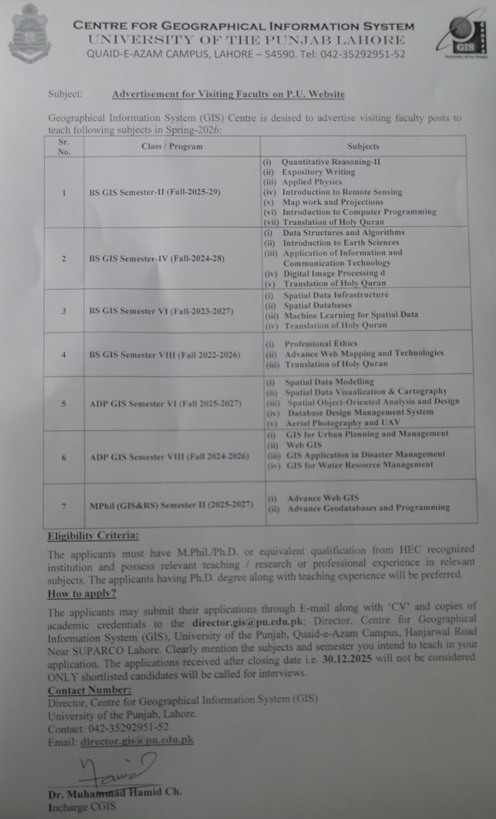 Job Type: Visiting Faculty Required (Centre for Geographical Information System) No. of Posts: Department: Centre for Geographical Information System