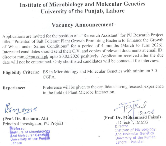 Job Type: VACANCY ANNOUNCEMENT - Research Assistant for PU Research Project (Institute of Microbiology and Molecular Genetics) No. of Posts: Department: Institute of Microbiology and Molecular Genetics