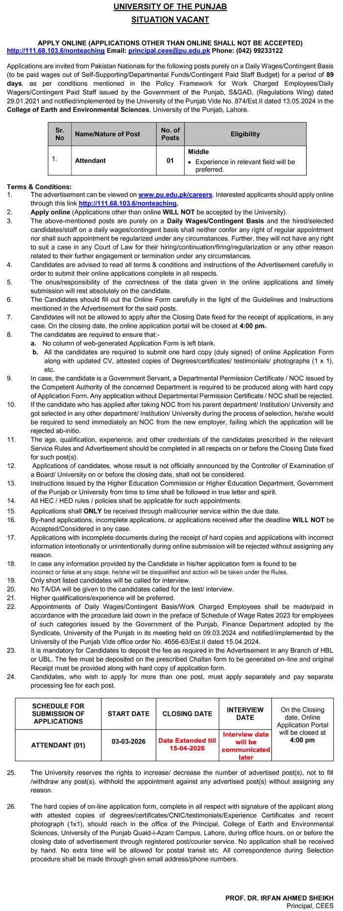 Job Type: SITUATION VACANT - Attendant (posts purely on a Daily Wages / Contingent Basis) (Date Extended) No. of Posts: Department: College of Earth and Environmental Sciences