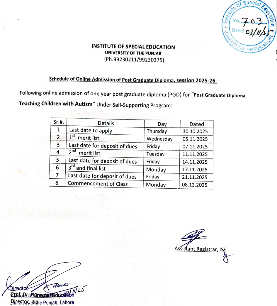 Schedule of One Year Post Graduate Diploma Teaching Children with Autism Session 2025-26