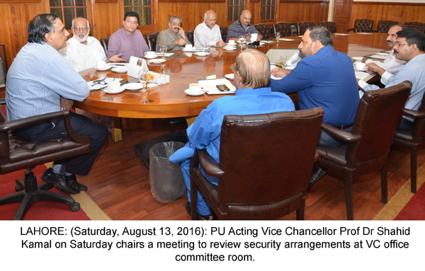 LAHORE: (Saturday, August 13, 2016): Punjab University Acting Vice Chancellor Prof Dr Shahid Kamal on Saturday chaired a meeting to review security arrangements at VC office committee room. On this occasion Registrar Prof Dr Liaqat Ali, Advisor to VC Col (r) Ikramullah Khan, Resident Officer-I Prof Dr Sajid Rashid Ahmad, Chairman Hall Council Prof Dr Abid Hussain Choudhary, Resident Officer-II Malik Muhammad Zahir, Deputy Director Students Affairs Zubair Akram, Chief Engineer Jamil Ahmad and Chief Security Officer Col (r) Muhammad Ubaid Masood were present. Resident Officer-I Dr Sajid Rashid Ahmad gave detail briefing about Punjab University’s security situation while the Acting VC Dr Shahid Kamal instructed the authorities concerned to improve security. Tweet Follow @pu_lhr_official |