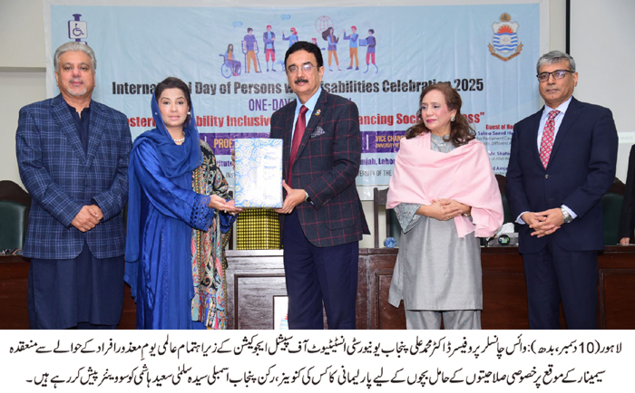 LAHORE: (Wednesday, December 10, 2025): Punjab University Vice Chancellor Prof Dr Muhammad Ali has said that everyone must play their role in making persons with special abilities vital members of society. He expressed these views while addressing a seminar on ‘Fostering Disability Inclusive Society for Advancing Social Progress’ organized by the Punjab University Institute of Special Education in connection with the International Day of Persons with Disabilities here on Wednesday. On this occasion, Convener of the Parliamentary Caucus for Children with Special Abilities and MPA Syeda Salma Saeed Hashmi, Punjab Secretary for Special Education Shoaib Iqbal Syed, Chairman Allah Wale Trust Shahid Lone, Director ISE Dr Humaira Bano, civil servants, faculty members, and a large number of students were present. In his address, PU VC Prof Dr Muhammad Ali said that in order to understand the needs of persons with special abilities, we must put ourselves in their place and think accordingly. He said that the confidence of parents is the key to the success of their children. Appreciating the services of teachers who train special persons, he said that while everyone else performs a job, these teachers carry out their duties with love, compassion, and empathy. He said that PU’s Institute of Special Education and Child Welfare Centre are playing an excellent role in the education and training of children with special abilities. Syeda Salma Saeed Hashmi said that in line with the vision of Chief Minister Maryam Nawaz Sharif, a parliamentary caucus has been formed to address the issues faced by persons with special abilities. She said that providing facilities to these individuals can bring positive change in society. She said that the government is taking concrete steps to make special persons an equal part of society and paid tribute to the teachers whose efforts enable persons with special abilities to become the pride of Pakistan. She also appreciated PU, ISE and the organizers for holding a seminar on this important theme. Shoaib Iqbal Syed said that collective dialogue is needed to improve the lives of persons with special abilities and make them active members of society. He said that it is a matter of pride that PU graduates are serving in all sectors. He acknowledged the challenges in teaching special persons but stressed that meaningful collaboration between institutions and the government can lead to significant improvement. He said that research must be promoted in line with societal needs and noted that the present government has substantially increased the budget for the welfare of persons with special abilities. Shahid Lone said that they provide food charity daily to 115,000 children studying in government schools and are working to increase this number to 200,000. He said that they provide scholarships for the education and training of special children and are collaborating with other NGOs for further improvement. He emphasized the need to promote focused research for accurate data. Dr Humaira Bano thanked the participants and highlighted the ongoing educational activities at the ISE. She said that graduates of the Punjab University Institute of Special Education are serving as teachers in several public and private universities. ![]() Tweet Follow @pu_lhr_official |